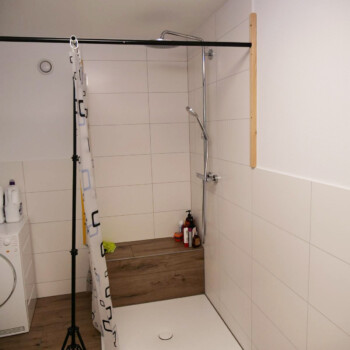 Lange genug hatten wir uns an unser Provisorium (Siehe Foto) zum Einzug gewöhnt. Aus einem Duschvorhang und günstigen Stativen für eine Fotoleinwand hatten wir die Dusche gebaut. Irgendwie hat das Provisorium so gut funktioniert, dass wir erst einige Monate nach dem Einzug und um die Duschkabinen gekümmert haben. Heute wurden endlich unsere Duschkabinen aus Glas montiert. Dabei war das ganze wirklich gar nicht so einfach. Hier hätten wir uns vom Architekten, Baufirma, Sanitärfirma irgendwie in der Planungsphase mehr Ideen gewünscht. Dass die Glaswände z.B. mit etwas Abstand auf die Wannen gesetzt werden müssen, hat uns genauso Kopfzerbrechen beschert wie dass dort wo die Wannen enden nicht automatisch dicke Holzbalken in den Wänden vorgesehen sind, an die man alles einfach massiv anschrauben hätte können. So waren die Vollholzbalken natürlich genau dort wo wir sie für diesen Zweck nicht brauchen konnten. Und das obwohl in der Werksplanung die Duschwannen bereits mit der richtigen Größe eingezeichnet waren. Auch eine gescheite Firma zu finden die uns zu noch bezahlbaren Preisen zwei Glasduschen herstellt und montiert war nicht so einfach. Zum Glück wurde und dann die Firma Konstanzer Glashandel aus Konstanz über Bekannte empfohlen.Da auch der Preis dann passte, haben wir uns für diese entschieden und waren hoch zufrieden! Klare Empfehlung! Wir sind auf alle Fälle nach dem ersten Duschen weiterhin froh, dass wir keine offenen Duschen gemacht haben.Einzig würden wir, wenn wir nochmal bauen, selbst darauf achten, neben der Dusche ggf. noch eine kleine Zwischenwand einzuziehen, so dass statt einer komplexen Einzelanfertigung das Ganze mit einer einfachen Glastüre lösen könnte. Leider kamen hierzu keiner Vorschläge oder Ideen während der Planung, weder von Architekt noch von Sanitärfirma.