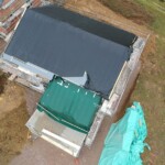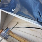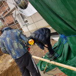 Dieses Sturmtief war aber deutlich stärker, wir hatten Sturmböen um die 90km/h, welchen unsere Planen standhalten mussten und auch der ergiebige Starkregen stellte die provisorische Dachkonstruktion ganz schön auf die Probe. Da die Plane unterhalb der Dachkonstuktion leider nur seitlich befestigt war, wurde diese von den starken Böen erfasst, blies sich zum Windsack auf und schob uns das Wasser weiter Richtung Wohnzimmer. Durch den starken Wind drohte die ganze Plane abzureissen. Ganz toll, das konnten wir überhaupt nicht brauchen. Unsere Holzbaufirma hat derzeit Betriebsferien, dennoch meldete sich der Inhaber selbst zurück und sagte uns zu, daß sie sich gleich nächste Woche um die restlichen Arbeiten am Rohbau kümmern wollten. Nur was tun bis dahin? Riskieren, daß die Plane vom Winde verweht wird und ggf. noch die Stabilität des Gerüsts gefährdet oder andere Schäden nach sich zieht?